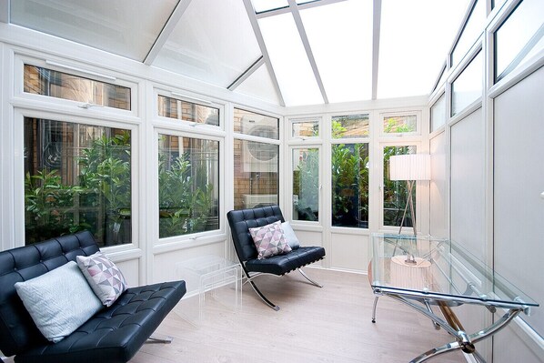 Relax in the inviting living area furnished with a cozy sofa and a flat-screen TV, equipped with complimentary Wi-Fi throughout the apartment. Adjacent to the living space is a charming conservatory, offering a tranquil spot to unwind.