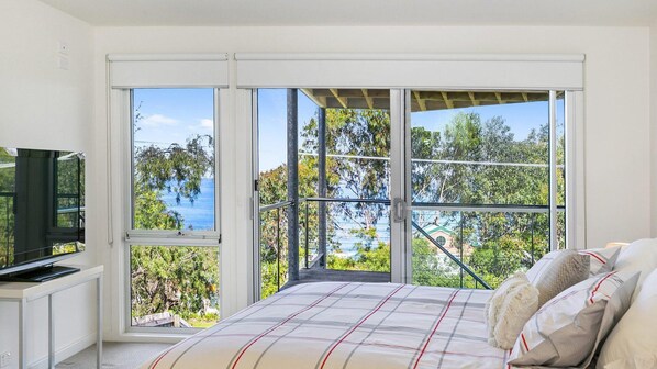 Alle Schlafzimmer im Erdgeschoss des Hauses. - Hauptschlafzimmer mit Kingsize-Bett, TV, Zugang zum unteren Balkon und Bad. Schlafzimmer 2 hat Queen-Bett und Balkon, während Schlafzimmer 3 2 x Einzelbetten hat. Der obere Wohnbereich dient auch als Schlafraum mit ausklappbarem Sofa. Siehe Anmerkungen unten.