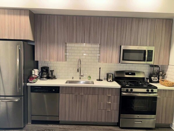 Enjoy a beautifully designed 1-bedroom, 1-bathroom apartment featuring a comfortable queen bed and an additional air mattress for extra guests.