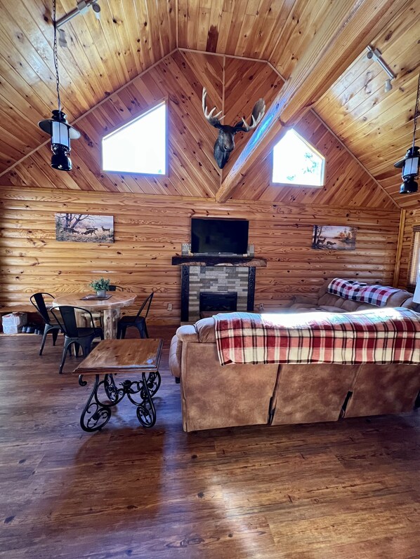 Beautiful and cozy 2 bedroom cabin nestled in the Bluegrass and Appalachian mountain region at Yatesville Lake on the border of West Virginia and Kentucky. The cabin is fully furnished with 2 bedrooms and 1 full bath, washer and dryer. Open living and dining area is anchored by cozy fireplace with beautiful live edge black walnut wood mantle. Reclining couch and love seat to enjoy watching 50 inch smart tv or spending time with family. Kitchen features all new hickory cabinets and new appliances. It also contains all the necessities you need to prepare your favorite breakfast, lunch or dinner. One full bathroom with shower/tub combo and plenty of towels, washcloths and hand towels to last your entire visit. Tissue paper also supplied. Downstairs bedroom sleeps 2 with log king size bed. Bedroom also has beautiful log dresser and armoire. Upstairs bedroom sleeps 6 with 2 log queen beds and beautiful log futon. Upstairs bedroom also features private covered porch over looking nature at its best. Each bedroom contains 32 inch smart tv. One full size air mattresses also available for use.