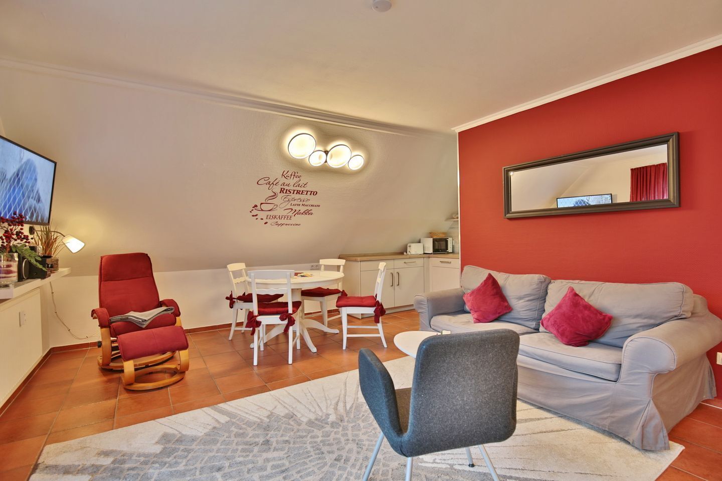 Die voll ausgestattete offene Küche ist ideal für gemütliche Kochrunden im Kreise Ihrer Lieben. Ihre eigene Terrasse lädt zu langen Sonnenbädern, Grillabenden oder einem ausgedehnten Frühstück mit duftenden Brötchen ein.
