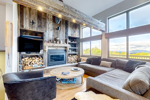 Panoramic views of Green Mountain ridgelines and the sweeping surrounding valley await at this lodge-like condo at Okemo Mountain Resort. In this gorgeous setting, you'll have ski-in/ski-out access to the beginner-level Sachem Trail and a wraparound deck with a private hot tub to soak in beneath starry skies.