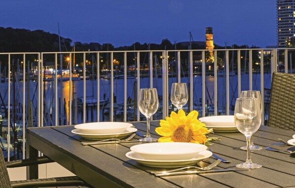 Auf der großen Terrasse können Sie den Sommer genießen und auch immer wieder Blicke auf die vorbeiziehenden Skandinavien-Fähren erhaschen. Genießen Sie hier einen schönen Blick auf die Trave mit den Giebelhäusern von Travemünde im Hintergrund, die Travemündung, die Ostsee und das Segelschiff "Passat".