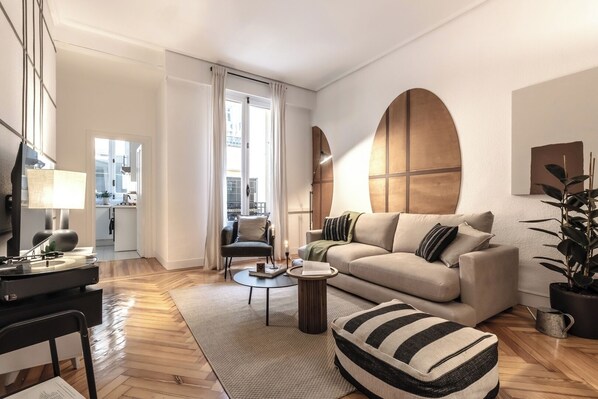 Spectacular apartment in General Martínez Campos street, with 2 bedrooms and 1 bathroom. The kitchen is equipped with appliances and kitchenware. The beds are equipped with soft bedding, ideal for a good night's rest. The apartment has 1 bathroom equipped with a full shower and towels. In addition, the apartment is equipped with high-speed WiFi and SmartTV. The apartment has a washing machine, dishwasher and air conditioning for your maximum comfort.