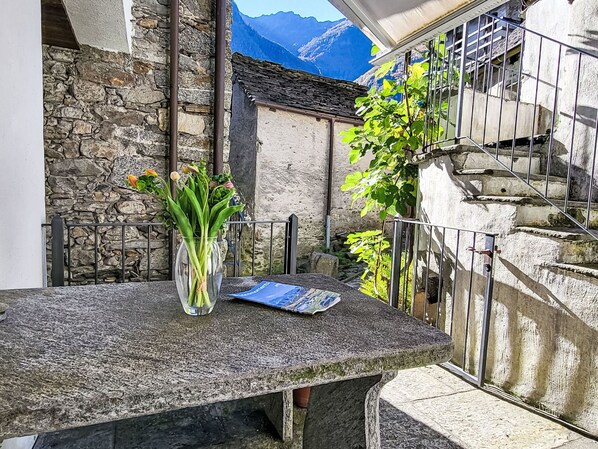 Someo 20 km von Locarno: Gemütliches Rustico "Ca Sina", auf 2 Stockwerken, aus dem 18. Jahrhundert. Im Ortszentrum von Someo, 50 m vom Waldrand, 200 m vom Fluss, Richtung Westen. Zur Alleinbenutzung: Sitzplatz, Terrasse, begrünter Innenhof. Zufahrt bis zum Haus. 100 m Fussweg bis zum Haus. Öffentliche Parkplätze 100 m auf der Strasse extra. Supermarkt 3 km, Bäckerei 3 km, Café 3 km, Bushaltestelle "Someo (Linie 315)" 200 m, Kieselstrand "Maggia" 200 m. Golfplatz (18 Loch) 21 km, Skipisten 22 km. Nahe gelegene Sehenswürdigkeiten: Vallemaggia, Foroglio / Mogno, Maggiatal-Schlucht, Flusshängebrücke von Giumaglio, Cascata di Foroglio. Bekannte Skigebiete sind gut erreichbar: Bosco Gurin 22 km. Bekannte Seen in der Umgebung sind gut erreichbar: Lago Maggiore. Wandergebiete: Vallemaggia, Valle di Lodano, Val Bavona. Objekt geeignet für 4 Erwachsene. "La Curtascia", 4-Zimmer-Haus 80 m2 auf 2 Stockwerken, Westlage. Objekt geeignet für 5 Erwachsene. Zweckmässig und antik eingerichtet: Esszimmer, niedrige Türrahmen, Höhe 175 cm mit offenem Kamin, Flachbildschirm, Radio, DVD und Heizofen. Offene Küche (Backofen, 4 Glaskeramikplatten, Toaster, Wasserkocher, elektrische Kaffeemaschine, Kapseln für die Kaffeemaschine (Nespresso) extra) mit E-Heizofen. Dusche/WC. Fussbodenheizung. Obergeschoss: (Aussentreppe) 1 Zimmer, niedrige Türrahmen, Höhe 175 cm mit 1 Doppelbett (1 x 160 cm, Länge 200 cm), E-Heizofen. (Aussentreppe) 1 Zimmer, niedrige Türrahmen, Höhe 175 cm mit 1 Diwanbett (140 cm, Länge 200 cm), E-Heizofen. (Aussentreppe) 1 Zimmer, niedrige Türrahmen, Höhe 175 cm mit 1 Diwanbett (120 cm). Sep. WC. Natursteinboden. Kleine Terrasse 12 m2, Westlage. Terrassenmöbel. Sicht auf die Berge und die Ortschaft. Zur Verfügung: Internet (WLAN). Bitte beachten: Kühlschrank ohne Gefrierfach, Nichtraucher-Unterkunft. Maximal 1 Haustier/Hund erlaubt. NL-00001234