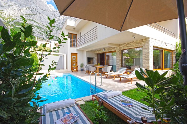 Ein eingener Pool und eine überdachte Terrasse mit Kamingrill sorgen