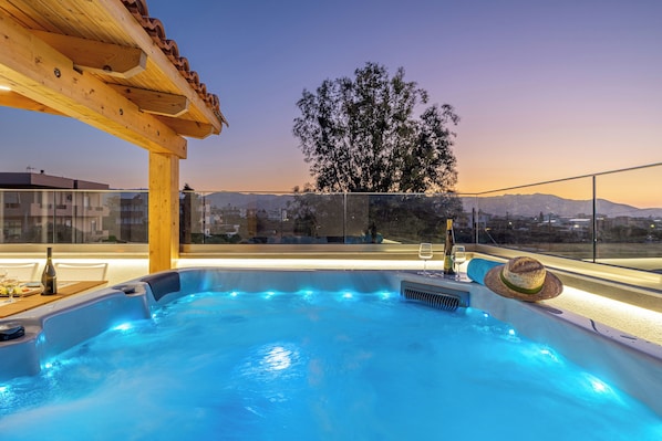 Our brand new, modern, luxurious, apartment on the 2nd floor offers, comfortable full view with stunning views of mountains and sea, large private spa / jacuzzi 5 people, large living room with 3 comfortable sofa beds, equipped kitchen, 2 bedrooms with comfortable beds, 2 bathrooms, a/c in all areas, fast Wi-Fi & 3 Smart TVs, free parking &