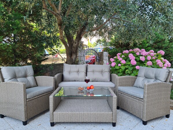 Das komfortable Apartment befindet sich auf einem 800 qm großen, geschlossen Garten grundstück mit Wiese, Blumen und Baümen.