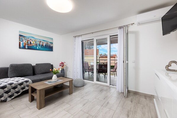 Ferienwohnung Tea 1 *** das moderne und gemütlich eingerichtete Ferienwohnung befindet sich an einem ruhigen Ort in Malinska und bietet Platz für bis zu vier Personen. Die Ferienwohnung besteht aus einer Küche, einem Wohnzimmer mit Schlafsofa für zwei Personen, Sat-TV, Internet und Klimaanlage, einem Schlafzimmer mit Doppelbett und einem Badezimmer. Die Küche ist mit 4 Keramikglaskochfeldern, einem Toaster, eine Mikrowelle, einer Kaffeemaschine, einem Wasserkocher, einem Kühlschrank und einem Staubsauger ausgestattet. Das Badezimmer verfügt über eine Dusche, eine Toilette und einen Haartrockner. Ein Bügeleisen und ein Safe stehen den Gästen zur Verfügung. Die Ferienwohnung verfügt über einen privaten Parkplatz und einen Balkon mit Blick auf das Meer. Im Hof ??des Hauses gibt es einen Grill, der mit den anderen Wohnungen im Haus geteilt wird.