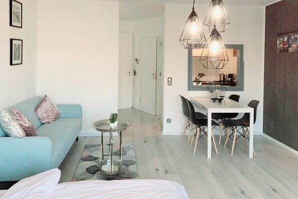 Die Wohnung ist 38 qm groß, luxuriös, stylisch und mit viel Liebe zum Detail eingerichtet.