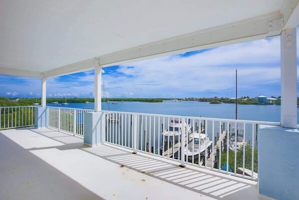 At the end of the hall, the primary suite has showstopping, sweeping water views, a private en suite bathroom, and a massive upper patio where you can watch boats drift by or catch the colors of a Keys sunrise in complete serenity over a cup of coffee.