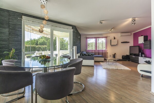 Im Ortsteil auf der anderen Seite der Hauptstraße, die Sie in zehn Gehminuten erreichen, liegt das Ortszentrum mit kleinen Geschäften, Markt, Lebensmittelläden, Postamt und Geldautomat. In der örtlichen Bar gibt es auch Internetanschluss. Nur fünf Autominuten fahren Sie zu den sehr guten Restaurants Luna oder Vesna, dessen Besitzer leckeren, istrischen Käse herstellen. Da es zum nächsten Autobahnanschluss nur zehn Minuten Fahrt sind, kann man von der Villa aus auch prima die istrische Halbinsel erkunden. Sehenswert sind das alte Stadtzentrum von Pula oder der Brijuni-Nationalpark. Zum nächsten Strand von Duga Uvala fahren Sie fünfzehn Minuten. Auch die schönen Strände von Pula laden zum Sonnenbaden und Schwimmen ein. In den Sommermonaten Juli und August finden in der Umgebung zahlreiche Feste statt.