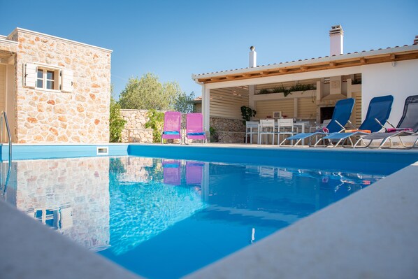 Harmonisch, Beruhigungsraum mit Schwimmbad 6,00 x 4,00 Meter befindet sich im zentralen Bereich. Am Pool gibt es Outdoor-Küche (enthält Herd mit Ofen, Kühlschrank mit Gefrierfach und Kochutensilien) mit großem Grill und Ess-Vintage-Tisch für 6 Personen. Es gibt auch eine Sauna und ein Bad / WC mit Dusche.