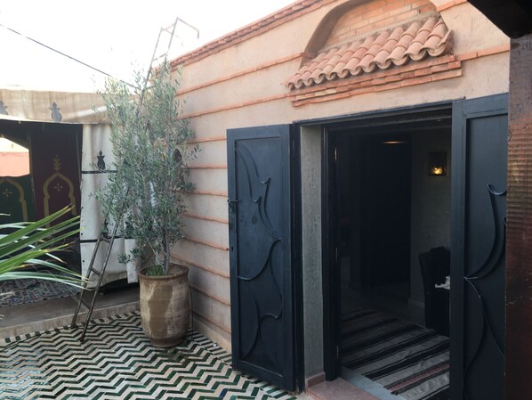 55 qm Wohnung mit direkt angeschlossener 45 qm-Terrasse mit arabischem Zelt. Typisch marokkanische Ausstattung mit Marmorböden und Marmorbad, etc. Eine abgeschlossene Wohnung mit eigenem Eingang auf ganzer oberster 3. Etage. Alle Einkaufsmöglichkeiten in unmittelbarer Nähe. Entfernung Medina ca. 3 Km (mit Taxi weniger als 10 Minuten).