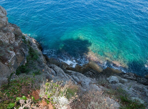 Nur 100 Stufen ermöglichen einen direkten Zugang zum Meer über einen privaten Abstieg der Villa mit Zugang zu den Felsen. Wenn Sie ein erfahrener Schwimmer sind (das Meer kann in der Gegend manchmal rau sein), können Sie zwei Höhlen in ca. 50 m Entfernung erreichen, von denen eine einen "Swimmingpool" hat, der über einen Tunnel von ca. 10 m zugänglich ist (Sie können) kann durchschwimmen), gekennzeichnet durch lila und blaue Farben.