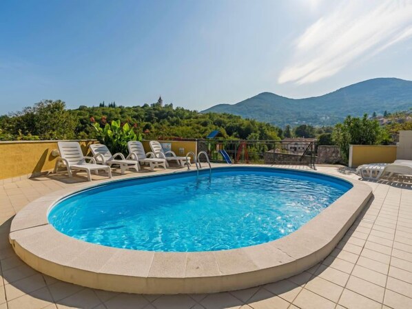Mihelići 5 km von Opatija: Schönes Dreifamilienhaus "Kate". Oberhalb von Opatija, im Weiler Mihelici, 5 km vom Zentrum von Opatija, ruhige, sonnige Lage, 5 km vom Meer, 5 km vom Strand, an einer Strasse, im Grünen. Zur Mitbenutzung: Grundstück 1'400 m2, gepflegter Garten mit Rasen und Blumen, Schwimmbad (23 m2, 150 cm tief, saisonale Verfügbarkeit: 15.Mai. - 15.Sep.). Laube (26 m2), Gartenmöbel, Grill (Schaukel). Im Hause: Internetzugang, Trampolin. Parkplatz beim Haus auf dem Grundstück. Einkaufsgeschäft 2 km, Restaurant 300 m, Bushaltestelle 500 m, Kieselstrand 5 km, Strandbad 6 km, betonierter Strand 5 km. Tennis 1 km. Bitte beachten: Weitere Unterkünfte sind buchbar. Das Schwimmbad ist oval.