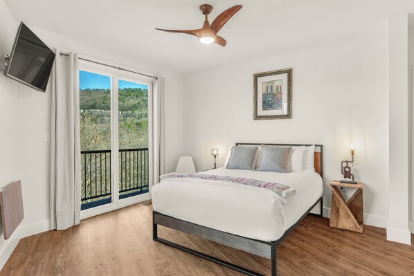 - BR2: queen bedroom with balcony access