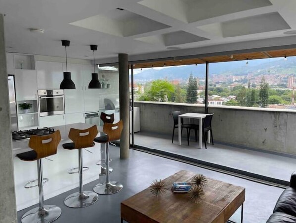 The balcony is furnished with a small table, providing an option for enjoying breakfast with the stunning Medellín skyline as your backdrop. A gas BBQ is also available for those in the mood to whip up homemade burgers.