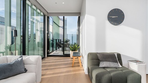 The generous open plan living and dining at The Clarke is drenched in natural light thanks to floor to ceiling glazing and fitted with luxurious furnishings showcasing contemporary style. There's indoor dining at the table setting plus outdoor dining on the private balcony, accessed from the living space.