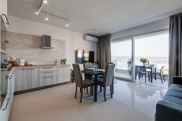 Ist 🌊 Steps from Mellieha Beach! Modern 1BR apartment with terrace, ensuite, kitchen & sea views 🐚☀️ Perfect for couples, friends & business stays. haustierfreundlich?