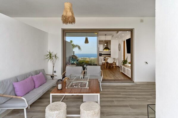 Das helle Wohnzimmer, die voll ausgestattete Küche und Klimaanlage in allen Räumen bieten höchsten Komfort während Ihres Aufenthalts.