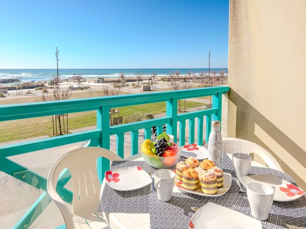 2-Zimmer-Wohnung 38 m2 im 2. Stock. Zweckmässig eingerichtet: Wohn-/Esszimmer mit 1 Doppeldiwanbett und TV (Flachbildschirm), Radio, CD und DVD. Ausgang zum Balkon. 1 Zimmer mit 1 franz. Bett (1 x 140 cm, Länge 190 cm). Kochnische (4 Kochplatten, Mini-Backofen, Geschirrspüler, Mikrowelle). Dusche, sep. WC. E-Heizung. Balkon. Balkonmöbel. Sicht auf das Meer. Zur Verfügung: Waschmaschine. Internet (WLAN, extra). Parkplatz Nr. 18. Bitte beachten: Maximal 1 Haustier/Hund erlaubt. TV nur FR. Rauchmelder.