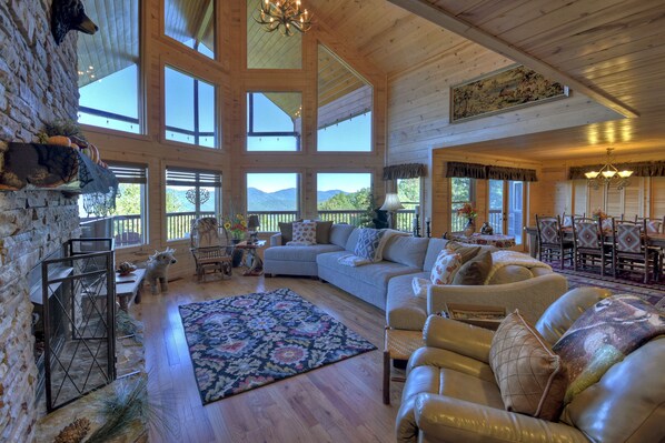 Sie finden auch die Einstiegstür hinter dem Esstisch. Dies führt Sie zu atemberaubenden Ausblicken auf die Berge, die von einer Seite zur anderen ein Panorama bieten! Genießen Sie alles mit reichlich Sitzgelegenheiten, während Sie den Sonnenuntergang hinter den Bergen beobachten. Auf der rechten Seite finden Sie eine riesige, abgeschirmte Veranda mit einem 65-Zoll-Fernseher über einem Holzkamin. Es gibt auch reichlich Korbmöbel zum Entspannen, während Sie Ihre Lieblingsshows oder das große Spiel sehen.