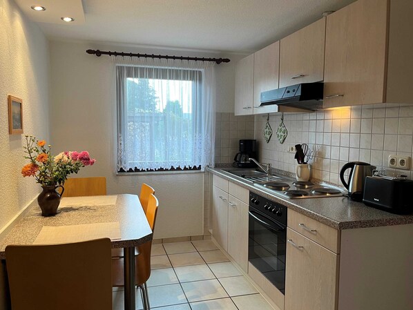 Ferienwohnung im Erdgeschoss mit 75 m² Wohnfläche, 1 Wohnzimmer, 1 Schlafzimmer mit einem Doppelbett, 1 Schlafzimmer mit 2 Einzelbetten, Küche, Bad mit Dusche und WC, SAT-TV, Radio, Bettwäsche und Handtücher inklusive.