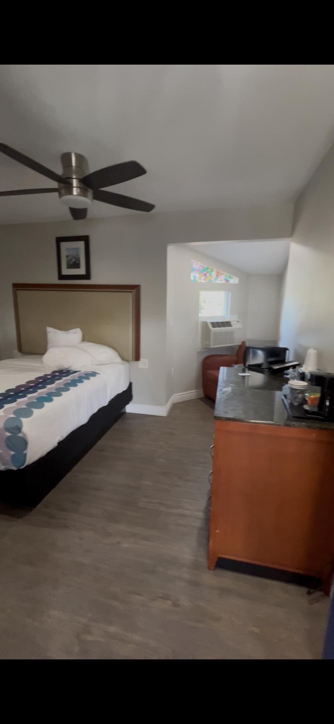Newly remodeled. Very nice room. Walking distance to pier. Front office staff were extremely helpful and friendly. Definitely would stay there again.