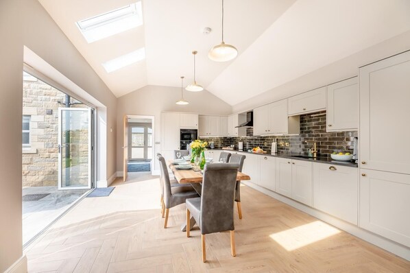 At the end of a busy day’s adventure, the charming entrance hallway welcomes you into this stunning country retreat and leads into the spacious open-plan lounge/kitchen/diner which features bi-folding patio doors onto the garden, perfect for inviting the outside in during the warmer months. The light and airy lounge area has two comfortable sofas, a wood burner effect gas fire and a Smart TV. Complete with a wonderfully high ceiling, this social hub provides everything you need to cook, unwind and dine with loved ones long into the evening. Off the hallway, you’ll also find a handy utility/boot room with a washing machine, coat hooks, a bench seat for putting on your walking boots and a separate downstairs WC. A ground-floor bedroom boasts a king-size bed, dual-aspect windows and a lovely en-suite shower room. On the first floor, you’ll discover another charming king-size bedroom with an en-suite bathroom, and a twin room boasting dual-aspect views and an en-suite shower room.