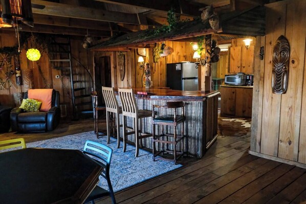 - Two private bedrooms, full bath and one half with a tub. Full kitchen and large living area with a unique bar for entertaining. Above the kitchen and living is a bed loft with three single beds for the kids. Large deck for entertaining friends.