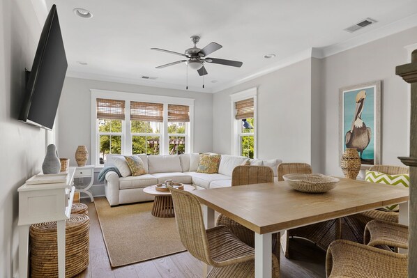 This modern 3-bedroom, 3.5-bath home is designed for both comfort and style. The open-concept main floor features a fully equipped kitchen with ample counter space and modern appliances, perfect for preparing meals or entertaining guests. The living area offers a large sectional couch and smart TV, creating a cozy spot to relax after a day at the beach. Adjacent is a dining area with seating for six.