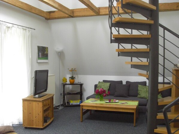 Unsere gemütliche Ferienwohnung liegt im ersten Stock unseres Hauses und ist über eine Wendeltreppe erreichbar.