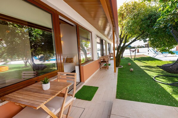 Die Villa ist von einem Garten mit Obstbäumen umgeben, zu dem ein erfrischender Pool, ein Spielplatz für die Kleinen und ein Grillplatz für Treffen im Freien gehören.