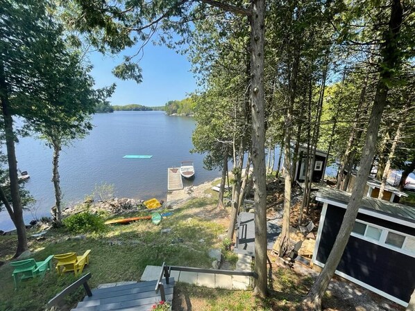 The main home consists of 2 separate living spaces including 2 fully equipped kitchens, 2 living rooms, 3 bedrooms, 2 bathrooms, private lake front, large terrace with abundance of eating and lounging areas, and a spacious parking lot. The 2 brand newly built, fully insulated 4 season air conditioned cabins are located just by the lake. Our property is located on a private dead end street, great for quiet walks. It’s an area where summer bugs are not bothersome.