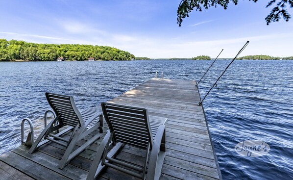 TIME OUT - Welcome to the cozy cabin! Perched above the lake with large windows exposing the greenery and lake view, you'll truly feel immersed with nature. Walkout from the main floor cottage to the deck for outdoor dining with a round table and 6 chairs (not pictured). Spend long, sunny days at the new, large dock, with expansive lake views. At the dock there is a small table and 4 chairs, two chaises as well as four folding chairs with two matching side tables (not pictured). At the water's edge there is a rocky walk-in, or deep swimming at the end of the dock, awesome for diving in!