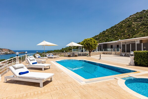 We came as a family on 10 and everyone of us thoroughly enjoyed ourselves. The Villa was outstanding with an amazing panoramic view. The Villa was fully equipped with lots of additional items. There were 10 very comfortable sun loungers. A lovely extra touch was the food package and mousaka on arrival and the surprise morning delivery of fresh fruit, veg, yummy cake & donuts, even fresh goat, lamb and homemade chips from the owners own farm and bbq. Simply spoilt. Thank you so much. Xx