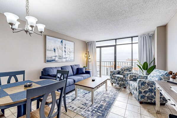 Ideal for a family or two couples, these spacious, newly renovated connected condos boast furnished balconies with ocean views, a well-equipped, full kitchen, private washer/dryer, dining area with seating for four, and a living area with a wall-mounted, flatscreen TV. On-site, guests will enjoy access to shared indoor and outdoor pools, a lazy river, hot tub, and a fitness room, all conveniently close to all that Myrtle Beach has to offer.