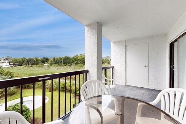 Take in views of the inlet from the privacy of your balcony, which provides alfresco dining. Keep an eye out for egrets and herons in the marsh.