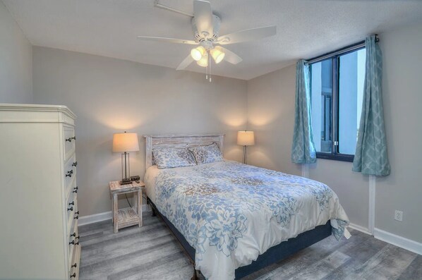 You will feel right at home at Holiday Towers 806, with amenities that include an in-unit washer and dryer, central heating and air, and elevator access. The bright great room brings the living room, dining area, and kitchen together. You can cook and still not be left out of the conversation. The kitchen is fully equipped and includes a dishwasher and microwave. There is also plenty of cabinet space to store drinks and snacks. There is plush seating in the living area, making it the perfect spot to sit back and watch a movie or have a family game night. There are four flat screen TVs to keep everyone entertained and complimentary WIFI. Stay connected with loved ones back home and share your favorite vacation photos.
