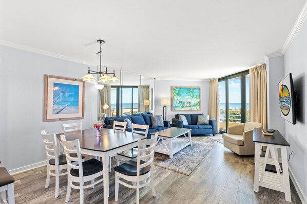 This recently renovated 2 bedroom, 2 bathroom condo has wonderful views of the ocean from your private oceanfront balcony. This unit in the North Tower of Ocean Creek Resort can accommodate a total of 6 guests with 1 king, 2 twins and a sleeper sofa. The unit features a washer & dryer, fully equipped kitchen, free Wi-Fi & cable TV in the living room & master bedroom.