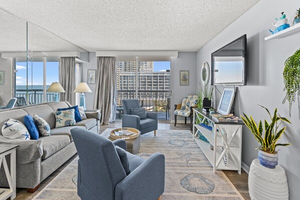 Beautiful ocean views from this condo on the 14th floor of South Hampton, located in Kingston Resort. This condo has been renovated with new living room furniture, flooring, and TVs. It has an open floor plan with coastal furnishings that will remind you day and night that you have arrived at the beach. It features a private balcony, free parking, and free high speed WiFi (400 Mbps). This unit can be combined with a lockout (3690963) to make a 2 Bedroom condo.