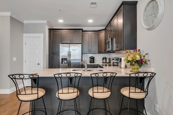Fully stocked kitchen with stainless steel appliances and bar seating