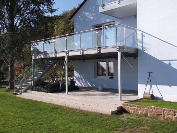 Unsere 55 m² große modern ausgestattete Wohnung besteht aus drei Räumen: einem Wohnzimmer, in das die Küchenzeile integriert wurde, einem Schlafzimmer sowie einem Bad. Zur Wohnung gehört eine ca. 30 m² große komplett überdachte Terrasse. Die Wohnung ist für bis zu 4 Personen bestens geeignet. Das Haus liegt in einer ruhigen Straße direkt am Waldrand und an den Weinbergen. Es bietet von der Terrasse aus einen Blick über die Rheinebene. Es handelt sich um eine Nichtraucher-Wohnung, Tiere nicht erlaubt.