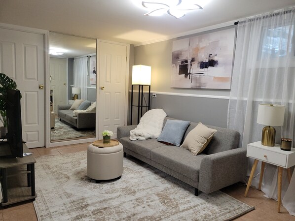 Experience Jamaica Queens like a local in this delightful 1-bedroom suite. This suite is located on the lower level of a private home . Features a beautiful living room with comfortable futon, a 55inch Smart TV perfect for relaxing after a day of exploring. Guests enjoy a cozy seperate 1 bedroom with a Queen bed, bathroom, seperate dining area and full kitchen with all the essentials for the entire place.. Guests also have use of a seperate office space with access to wifi if working remotely. Whether you’re here for a quick getaway or an extended visit, this charming home offers a perfect blend of comfort and ease. Our place is equipped for long stays to make your holiday one to remember.