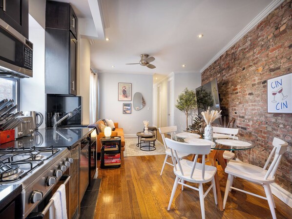 Lovely apartment. This place has a terrific location, with many great restaurants nearby and subway close as well. It's also close to the Holland Tunnel if you need to get to New Jersey. It was easily able to accommodate my family of 5. Note that it has a washer/dryer, though it wasn't listed on amenities when we were searching on VRBO. It's also great that it's the only apartment in a small building, so there are no people walking above or below. Beds are very comfortable too, and owner is very responsive.