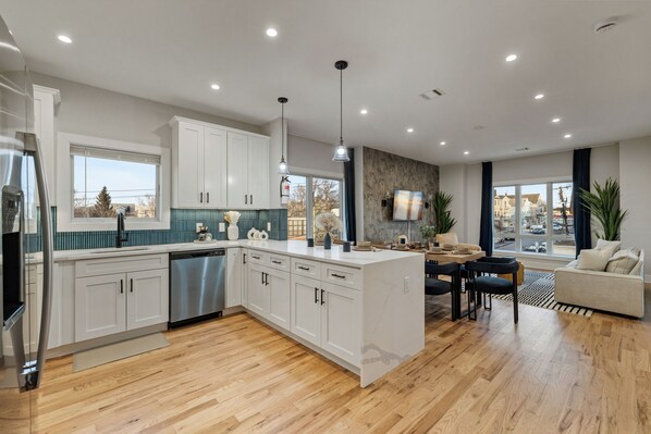 It is fully equipped with modern cooking appliances that make it suitable for preparing any meal, whether a simple breakfast, quick snack or a three-course gourmet dinner. Spacious countertops extend into the kitchen counter provide plenty of room for you to work your MasterChef magic.
