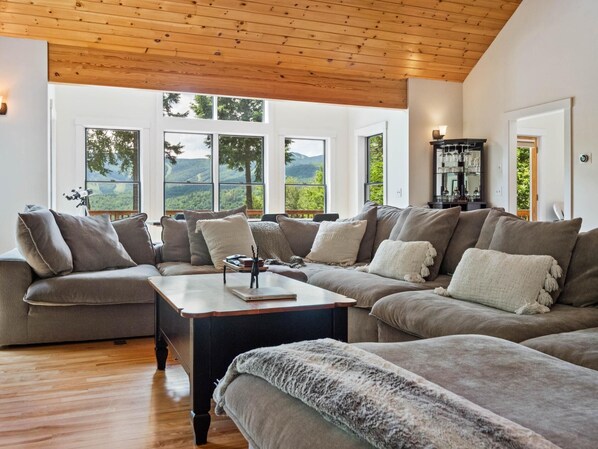 Treetop Retreat offers 2 levels of outdoor space. The first being the upper deck where you can enjoy outdoor dinning with sunset views over the mountain or relax in one of the Adirondack chairs with a cocktail. The lower deck features a comfy sitting area with a gas fire place looking out over the highlight of Treetop Retreat, the luxurious Swim Spa, a 20ft long pool/hot tub combo sunken in a wrap around deck open year round!. The "swim" section of the pool spa offers a great plunge pool option or turn on the jets and get a relaxing workout by swimming against the current. The attached spa is a comfortable 6 person jetted hot tub. Imagine spending your evenings under the stars, the bubbling water providing the perfect backdrop for relaxation and rejuvenation.