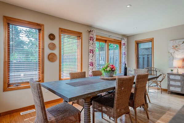 This is a wonderful place to watch that cook in your family or for everyone to help out. Patio doors lead out to the back yard with a deck that has seating for all your guests, gas BBQ/grill, and a garden area.