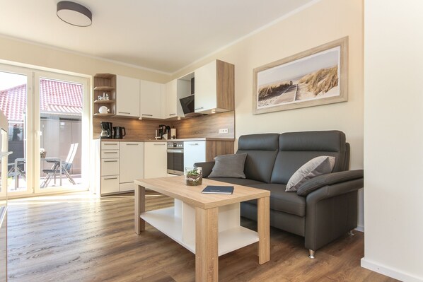 Die offene Wohnküche ist mit einer hochwertigen Einbauküche und einem Essbereich mit Tisch und Stühlen ausgestattet. Der Wohnbereich bietet einen großen Fernseher, ein gemütliches Ledersofa und einen Sessel. Von hier aus haben Sie einen direkten Zugang auf die Terrasse.